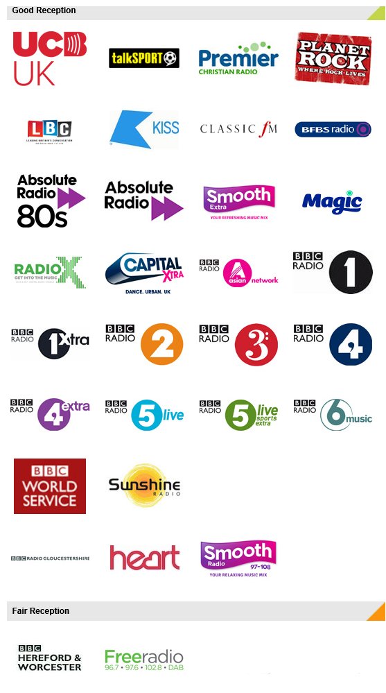 BBC Radio Gloucestershire is on 104.7MHz or 95MHz around Stroud and 95.7MHz around Cirencester. Severn Sound is on 102.4MHz and 103MHz around Stroud. CAT FM is on 107.5MHz for Cheltenham and Tewkesbury. BBC Radio 5 Live is 693KHz (Droitwich) in the North and 909KHz (Clevedon) in the South of the County. BBC Radio 4 Long Wave is on 198KHz from Droitwich. Digital Commercial Radio can now be received locally from Churchdown Hill or Ridge Hill but an outside band III aerial is probably necessary for BBC digital radio transmissions. Turners Hill, Mendip and Wenvoe are the other transmitters likely to provide a digital radio service in Gloucestershire. * - Only from Main Stations