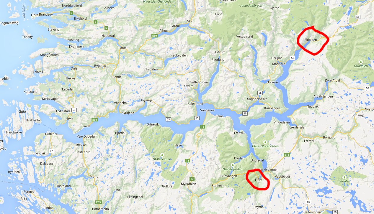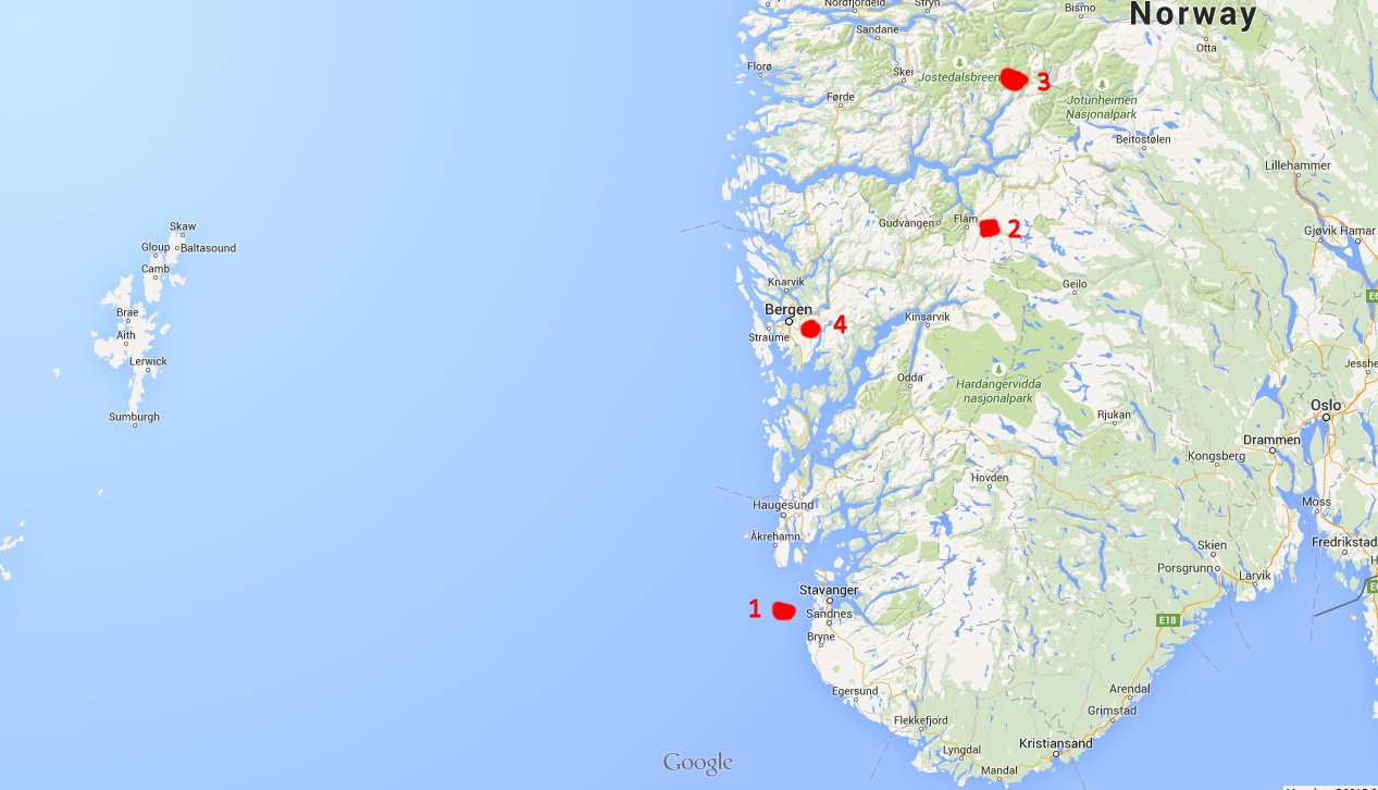 1-Stavanger 2-Flåm 3-Skolden 4-Bergen