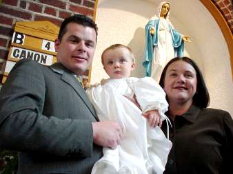 on her Christening Day, 2nd April 2000 with proud Mum and Dad below |